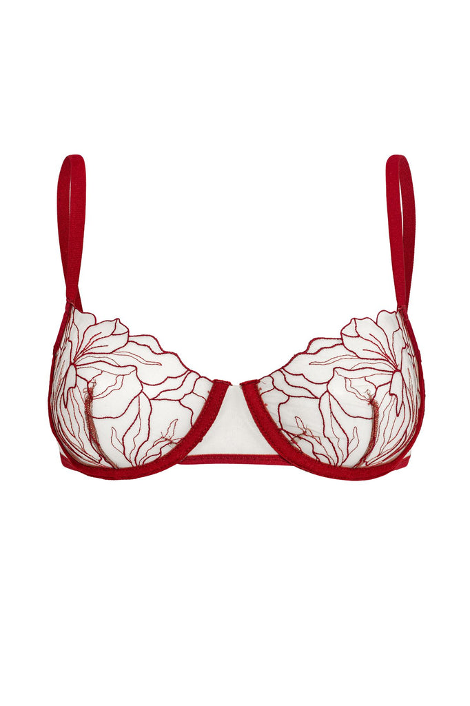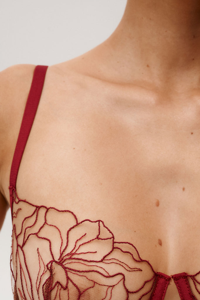 Incredibly delicate embroidery that beautifully adorns the bust, combined with  mesh. This lingerie matches the skin colour perfectly and makes the embroidered flowers look as if they have been painted on the skin. Burgundy is our color of the season - sensual, feminine, and effortlessly elegant.