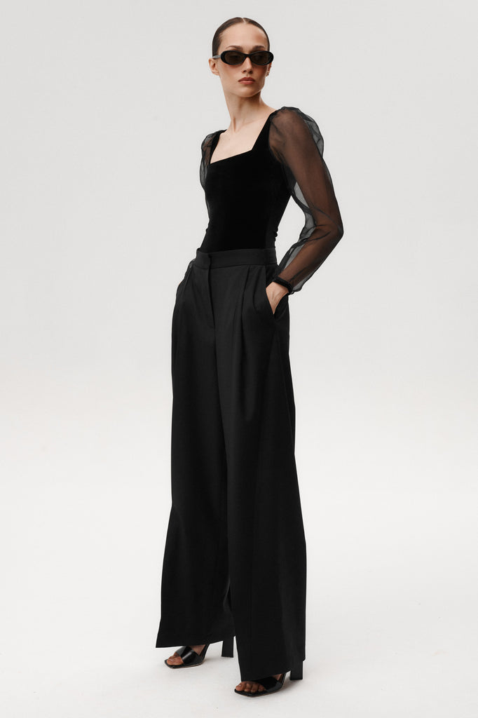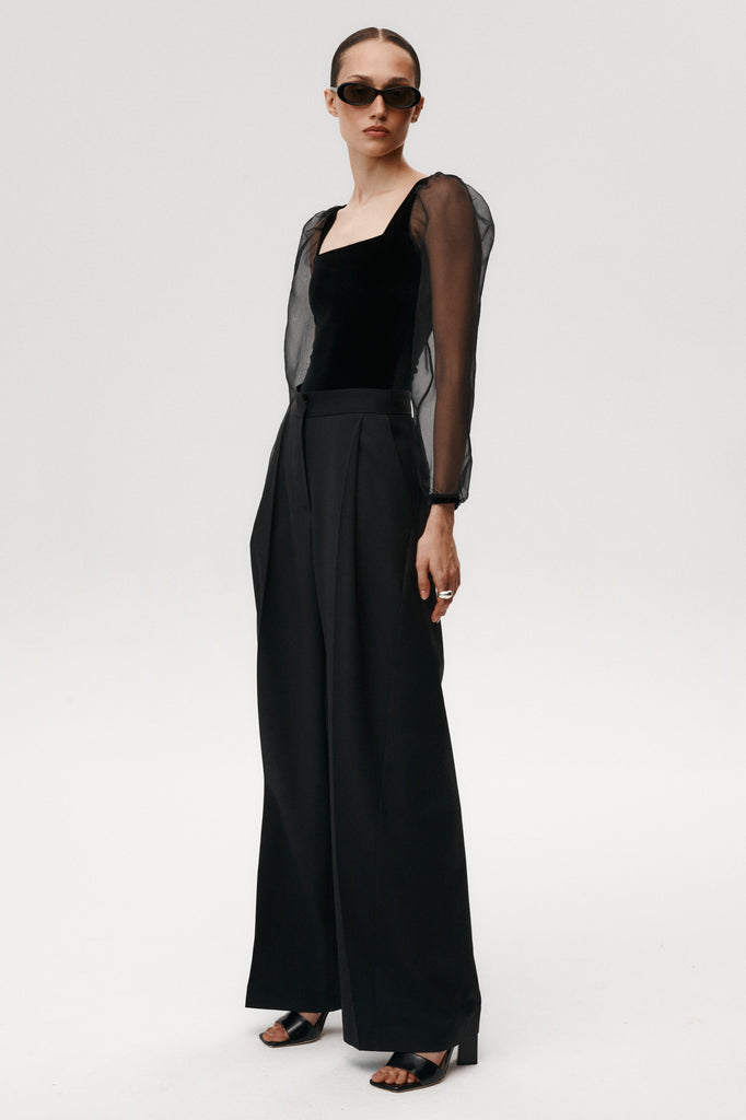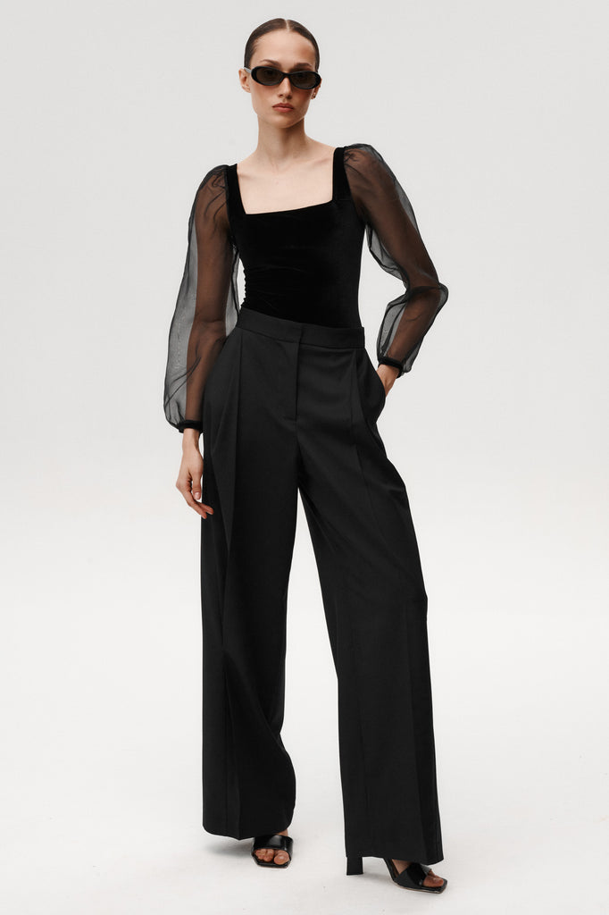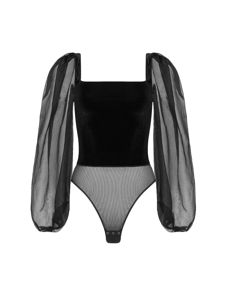- Hergestellt aus schwarzem Velours mit Ärmeln aus 100% Seidenorganza.