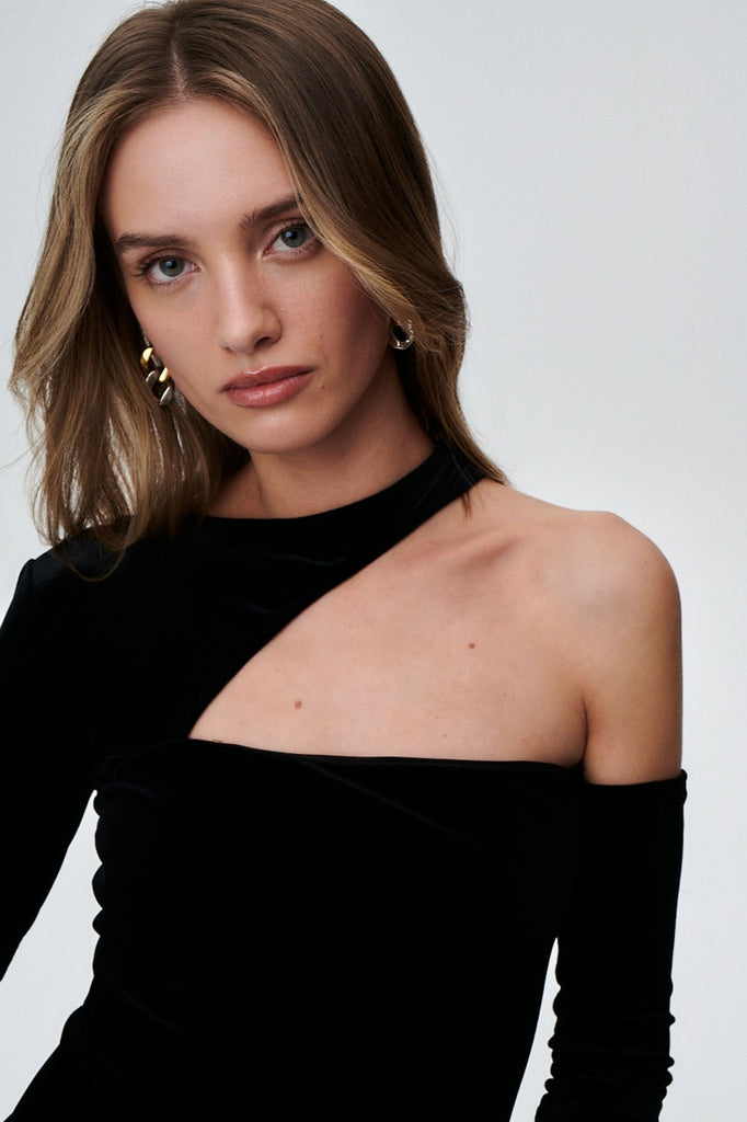 Schwarzes Samt-Minikleid mit einer großen Portion Nonchalance. Ein klassischer Schnitt, ein Cut-Out, das die Schultern wunderschön betont, und ein tiefes Schwarz. Dieses Kleid braucht nichts weiter, es ist einfach da: atemberaubend und elegant.