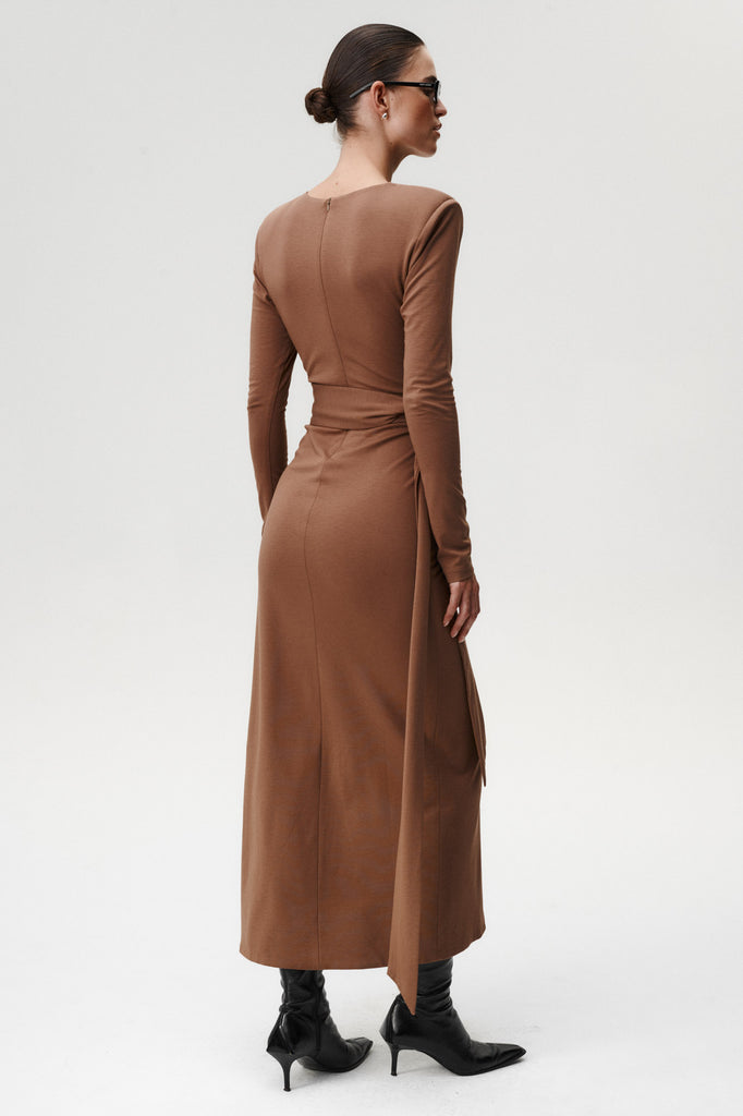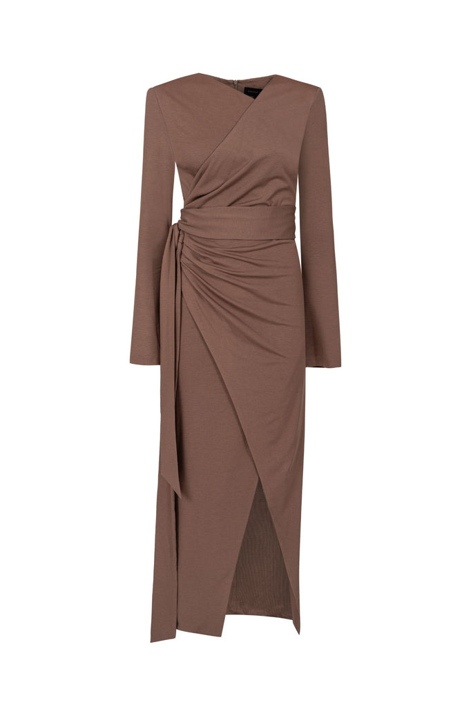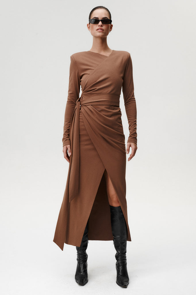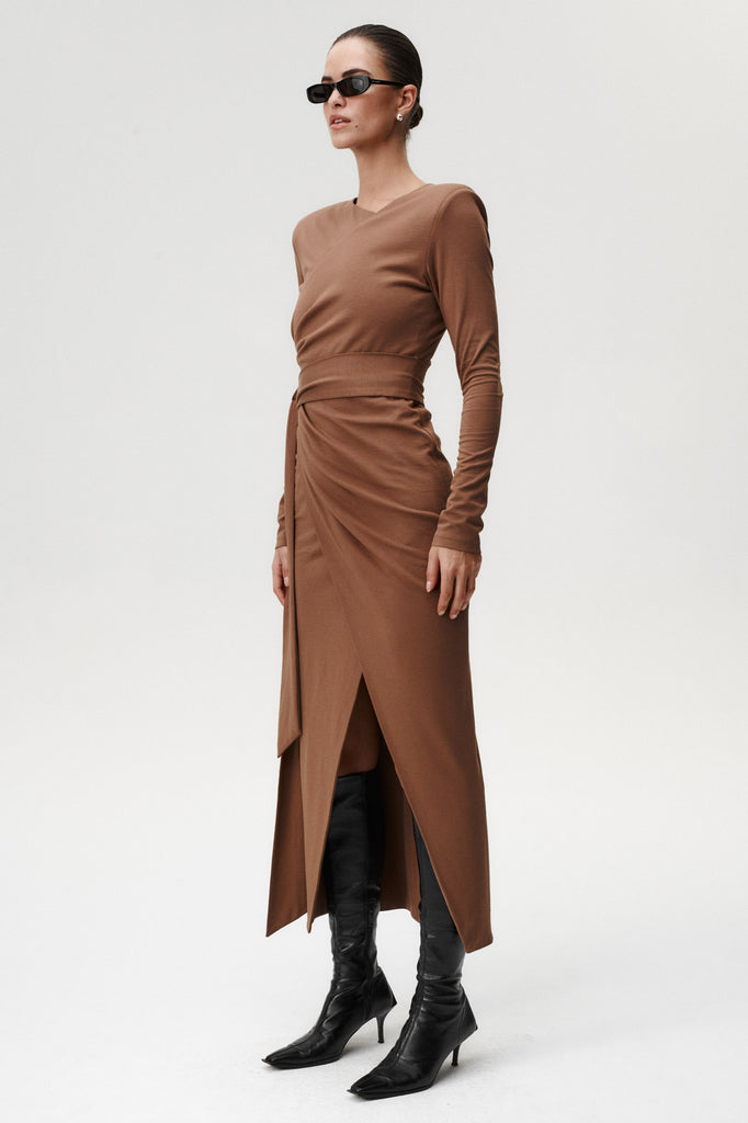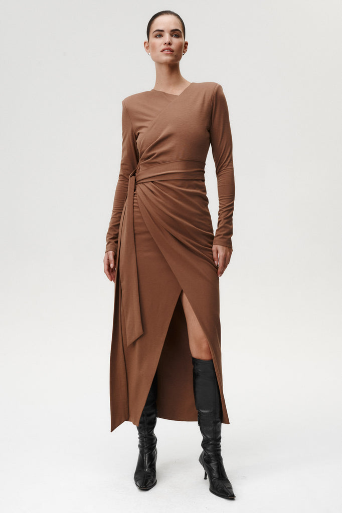 Das Audrey Kleid in Braun ist Eleganz mit Substanz. Gefertigt aus einem edlen, schwer fallenden Stoff, schmiegt es sich mühelos an den Körper und strahlt zugleich eine gepflegte Präsenz aus. Die Wickelsilhouette wird durch Frontfalten und einen langen Gürtel ergänzt, der sich zweimal um die Taille legt. Ein asymmetrischer Schlitz verleiht dem Look eine subtile, moderne Note. Der tiefe nussbraune Farbton mit einem Hauch von Rosé erinnert an die Wärme des Herbstes, ohne sich dabei auf eine Jahreszeit zu beschränken. Das weiche, angenehme Material liegt sanft auf der Haut und macht das Kleid genauso gemütlich wie raffiniert. Perfekt für gepflegte Office-Looks oder in Kombination für elegante Abendauftritte.