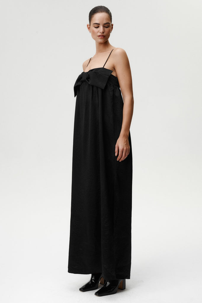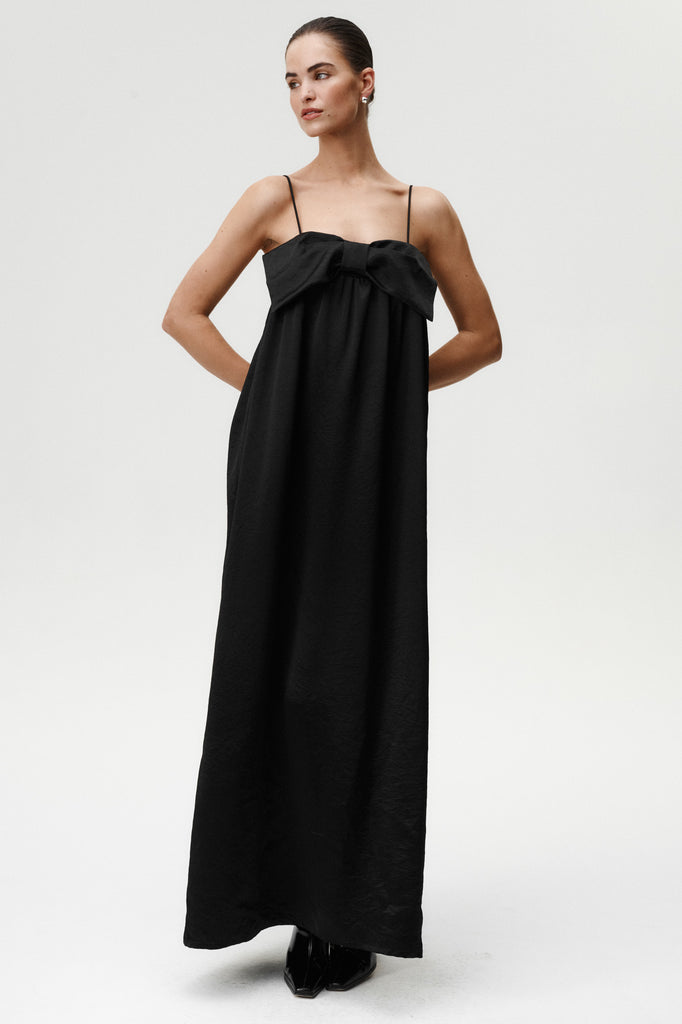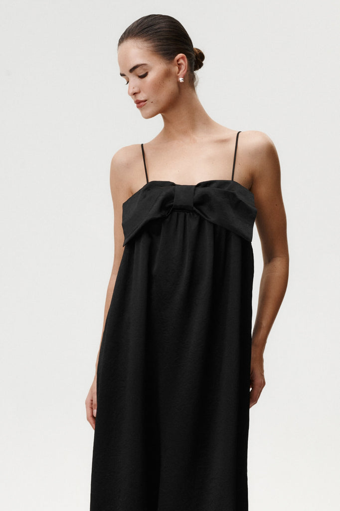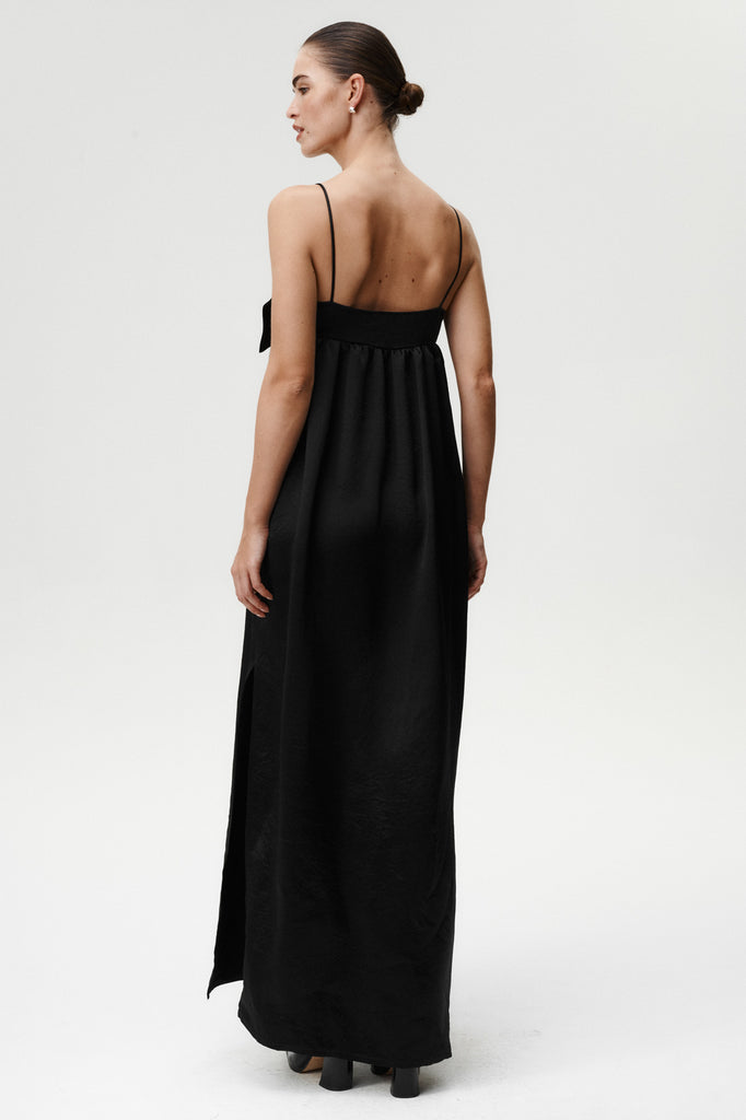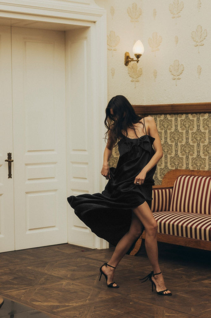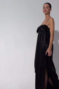 Eine moderne Interpretation zeitloser Eleganz. Das Belleza Kleid besteht aus glänzendem Acetatstoff, der wunderschön fällt und sich bei jeder Bewegung anmutig mitbewegt. Die strukturierte Schleife am Bustier, die an den oberen Ecken befestigt ist, verleiht einen markanten, femininen Akzent. Mit Spaghettiträgern, feinen Raffungen unter der Brust und einem seitlichen Schlitz betont es die Figur und bietet gleichzeitig mühelosen Tragekomfort. Der weite Saum sorgt für dezentes Volumen, perfekt für Abende, die nach unaufdringlichem Glamour verlangen.