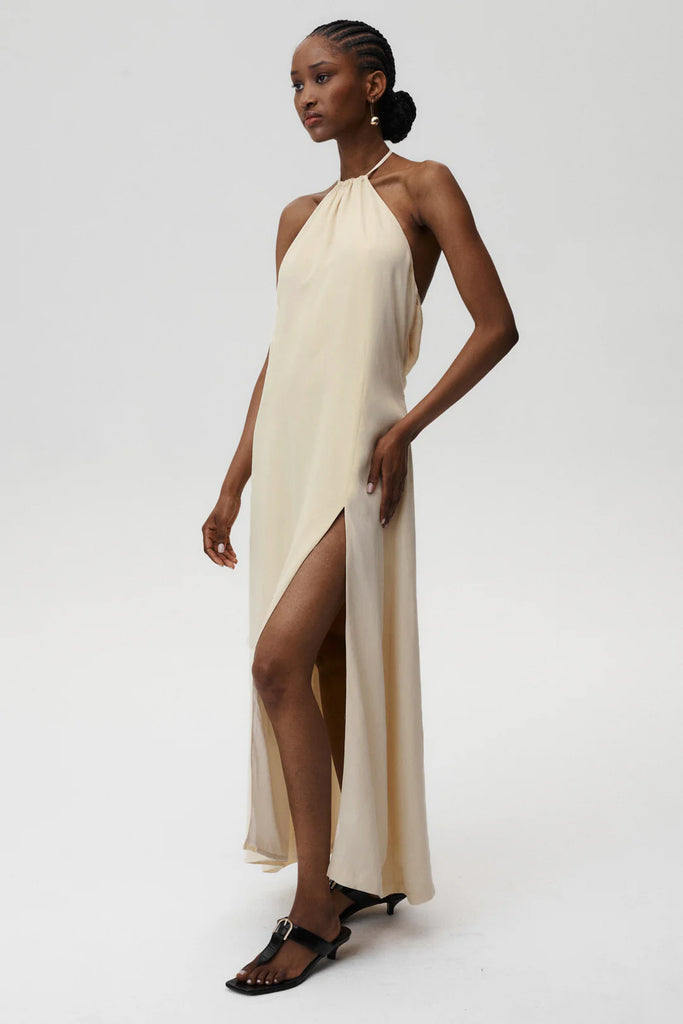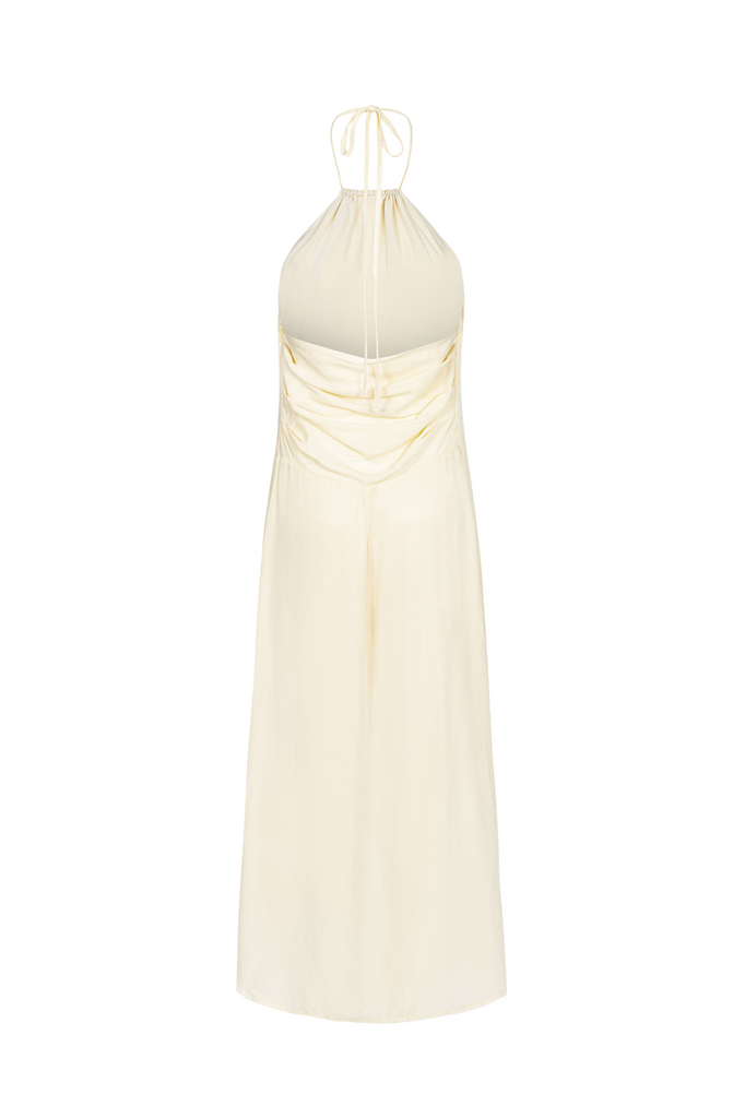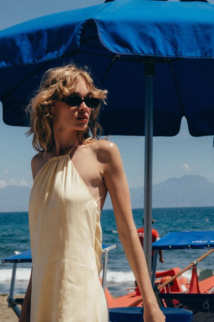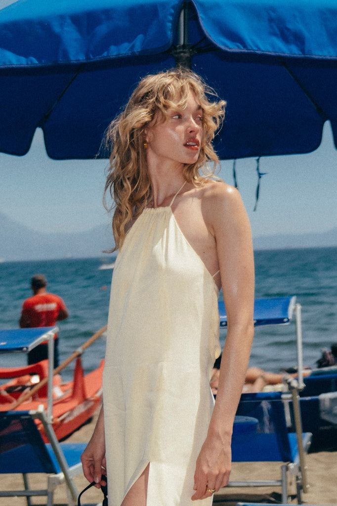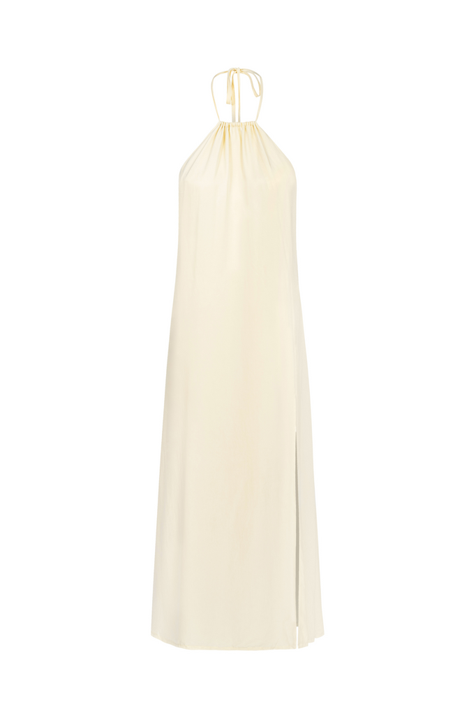 Ein Kleid, das keine Accessoires braucht. Klassisch vorne, mit einem Neckholder-Ausschnitt und einem Schnitt bis zum Oberschenkel, begeistert es hinten mit seiner Zartheit und dem lässigen Bindeband.