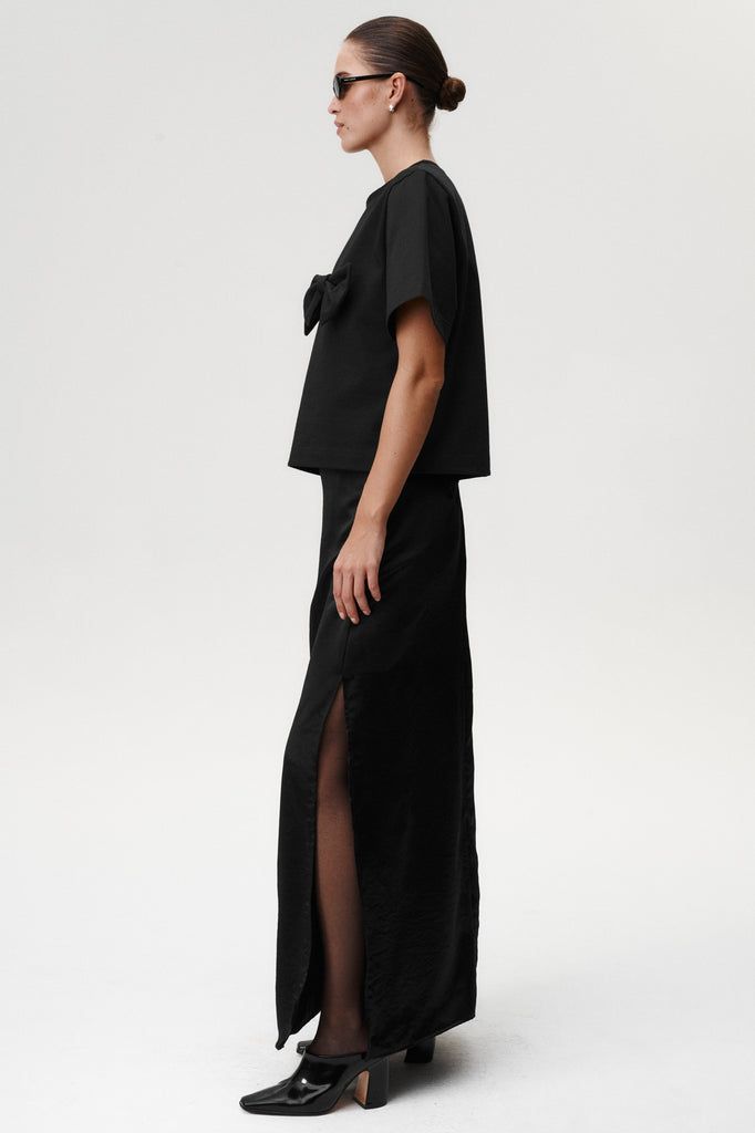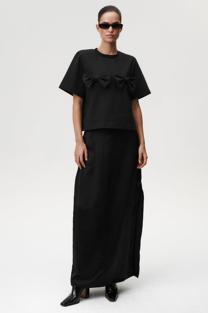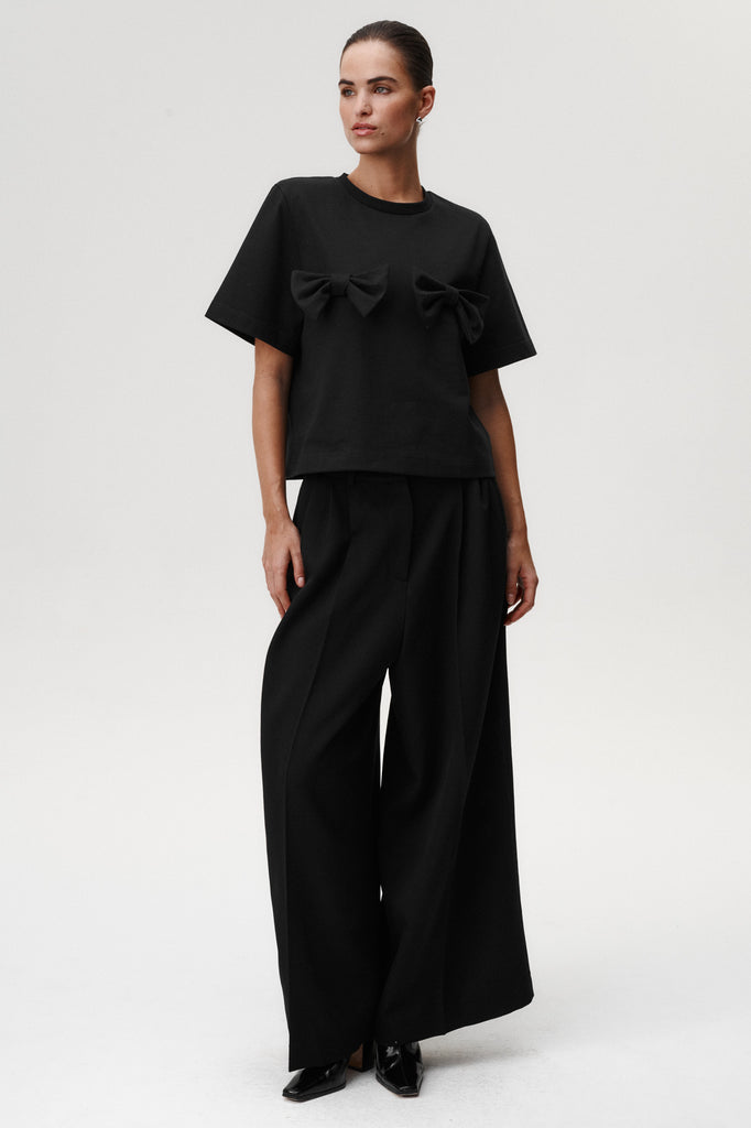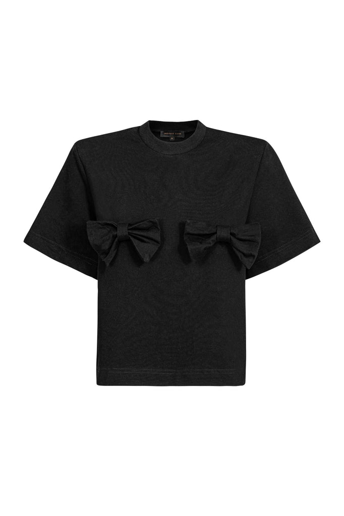 Ein Alltags-Essential mit einem verspielten Twist, das Everly T-Shirt ist alles andere als basic. Aus dickem, hochwertigem Baumwollstoff gefertigt, überzeugt es mit einem perfekt geschnittenen Cropped Fit und gepolsterten Schultern für eine markante, moderne Silhouette. Zwei Statement-Schleifen auf der Brust verleihen dem Shirt einen Hauch Charme und das gewisse Etwas. Erhältlich in klassischem Schwarz oder zartem Creme, es ist dein Go-to-Piece für mühelosen Stil mit einer Prise Attitude.