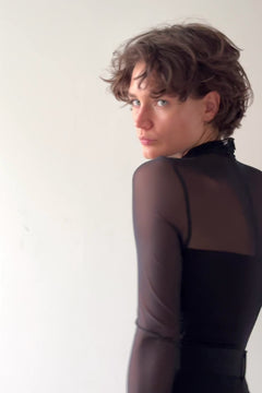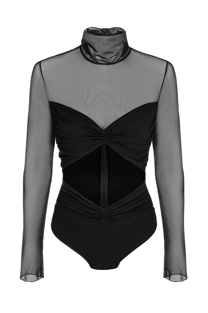 - Hoher Halsausschnitt und Oberkörper aus transparentem Netzstoff.