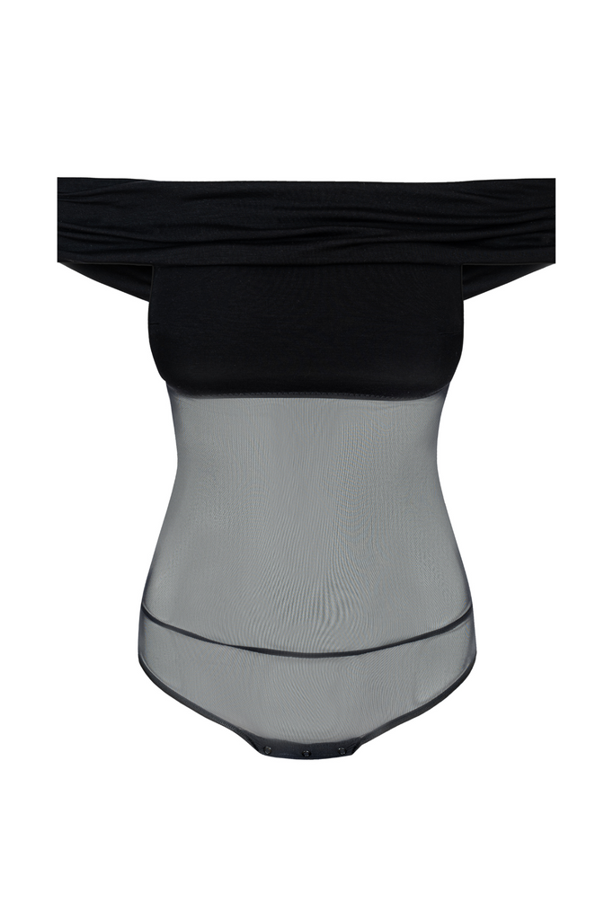 - Schwarzer Body mit herabfallenden Schultern und drapiertem Ausschnit.