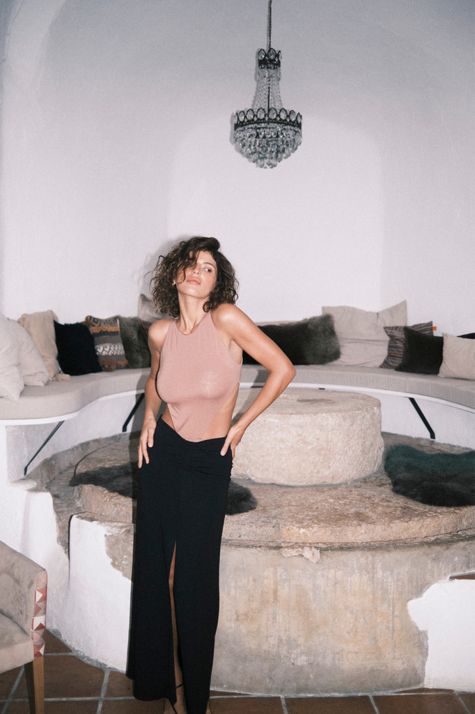 - Zwei große Cut-Outs an den Seiten betonen die Taille.