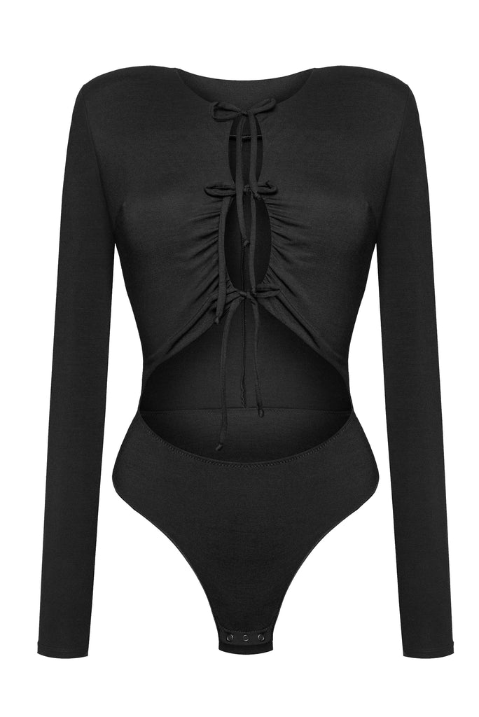- Three cut-outs at the front with ties to make the bodysuit fit your body perfectly.