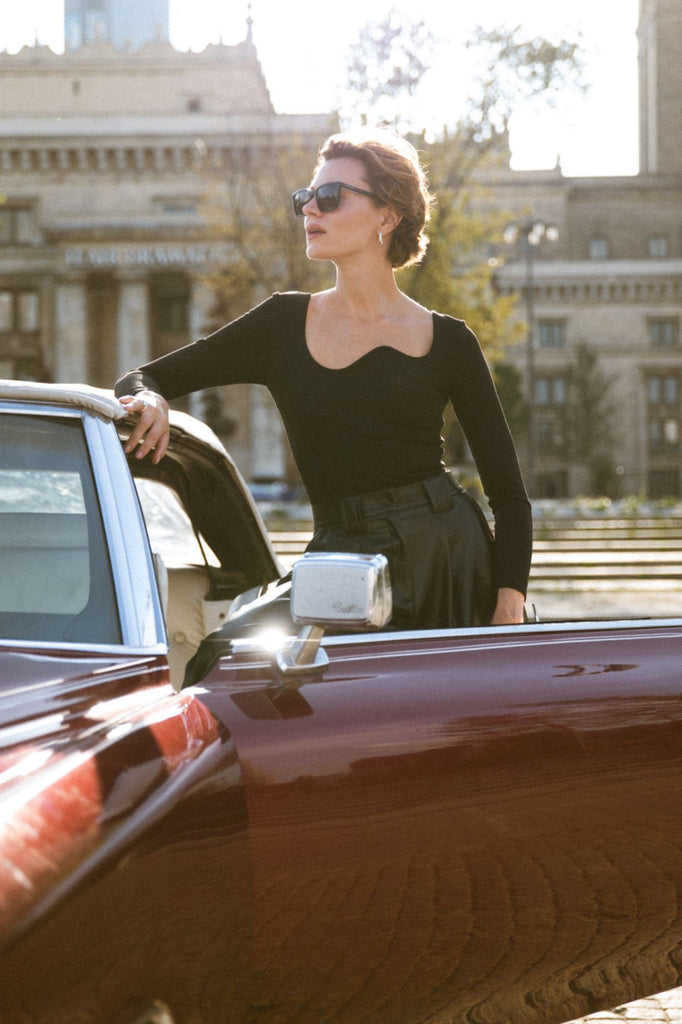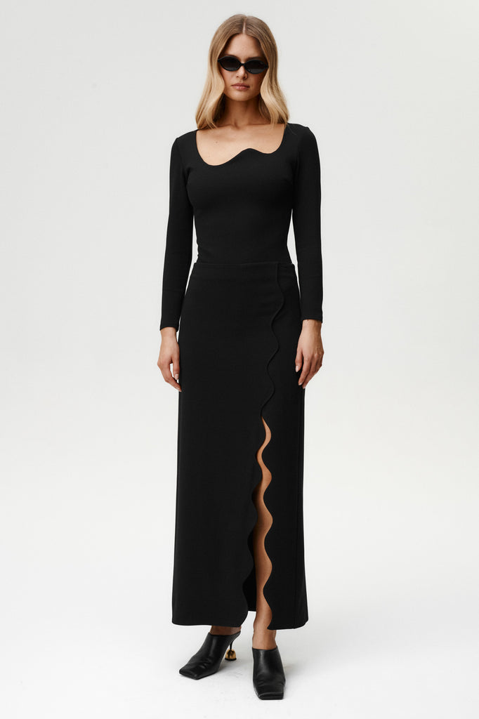 It is all about sculpted elegance with a twist. Its asymmetric neckline is shaped into a wave, creating a focal point that feels both modern and refined. Cut from a dense, body-contouring fabric, it sculpts the figure for that perfectly snatched effect while remaining comfortable to wear. The back is kept clean and minimal, letting the bold front detail take center stage. Pair it with the Ariel Skirt for a complete set that balances timeless sophistication with unmistakable UC edge.