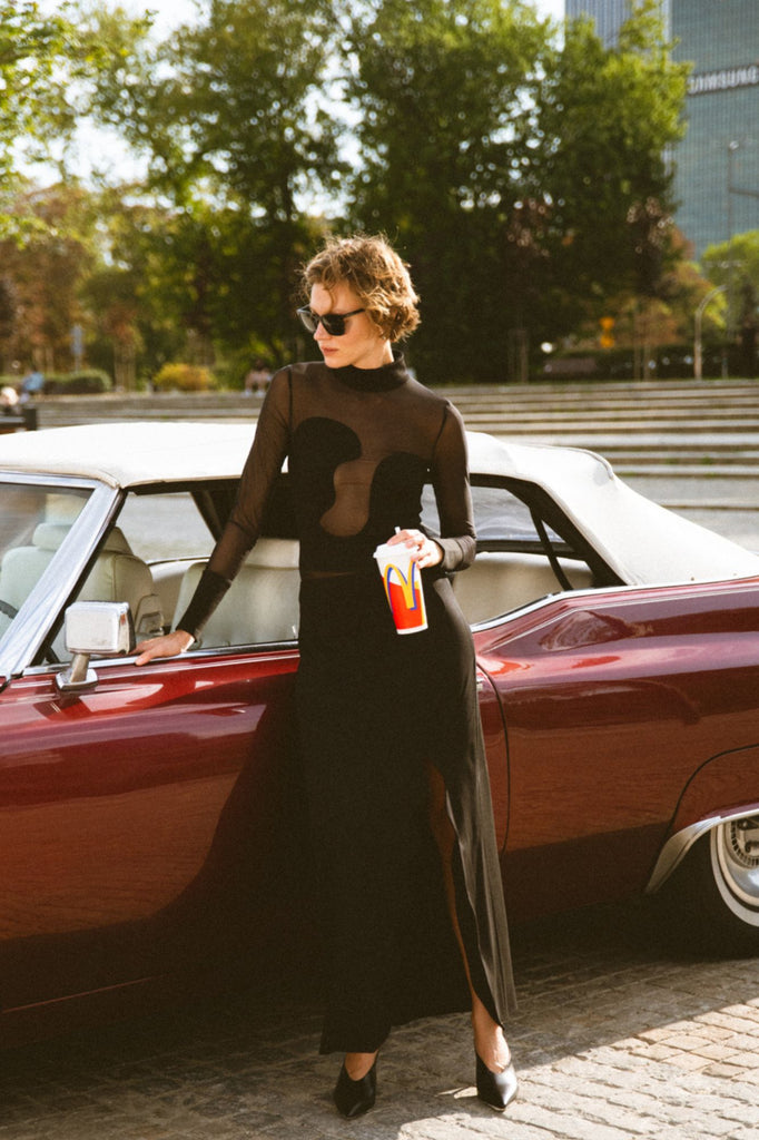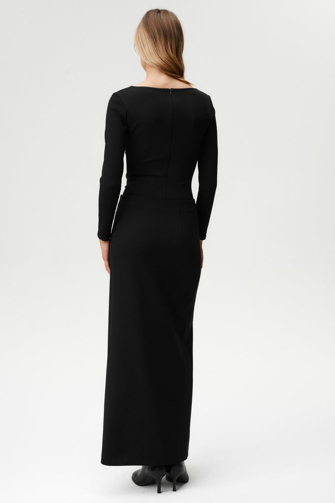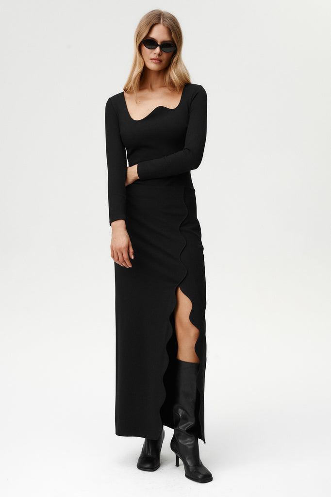 - Dramatic wave-shaped slit for movement and leg reveal.