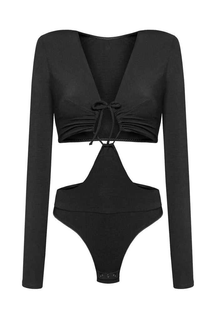 - Half-neckline and a slightly asymmetric cut-out imitating a boat neckline.