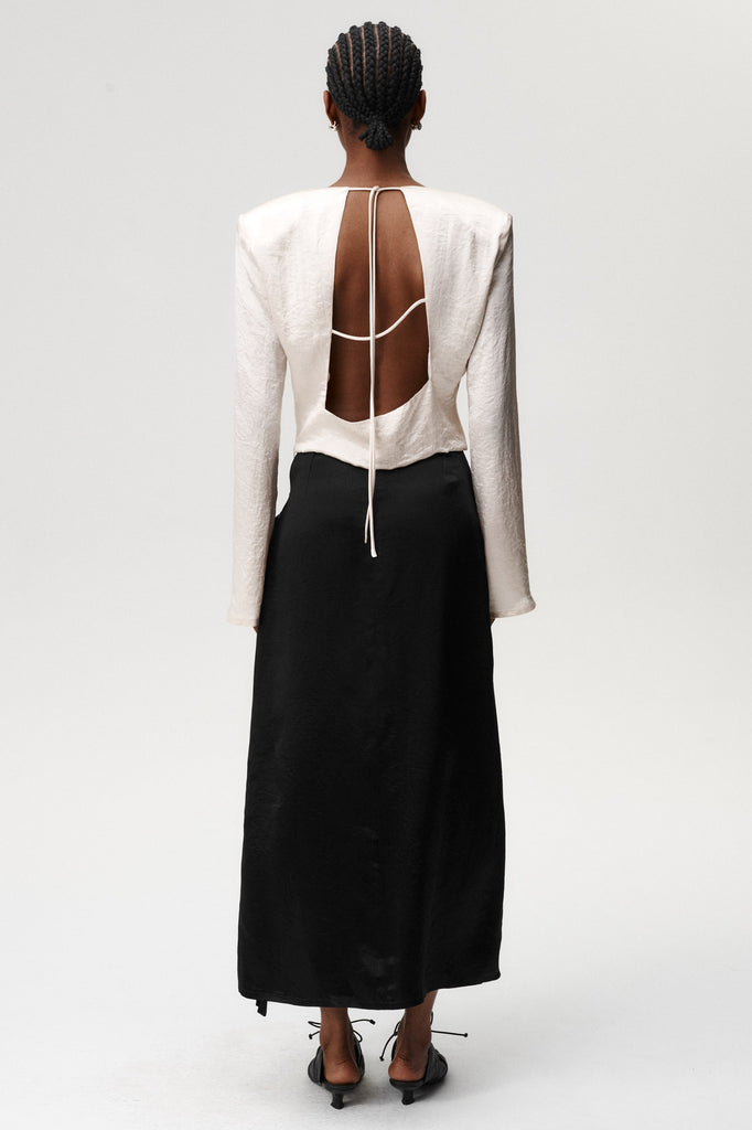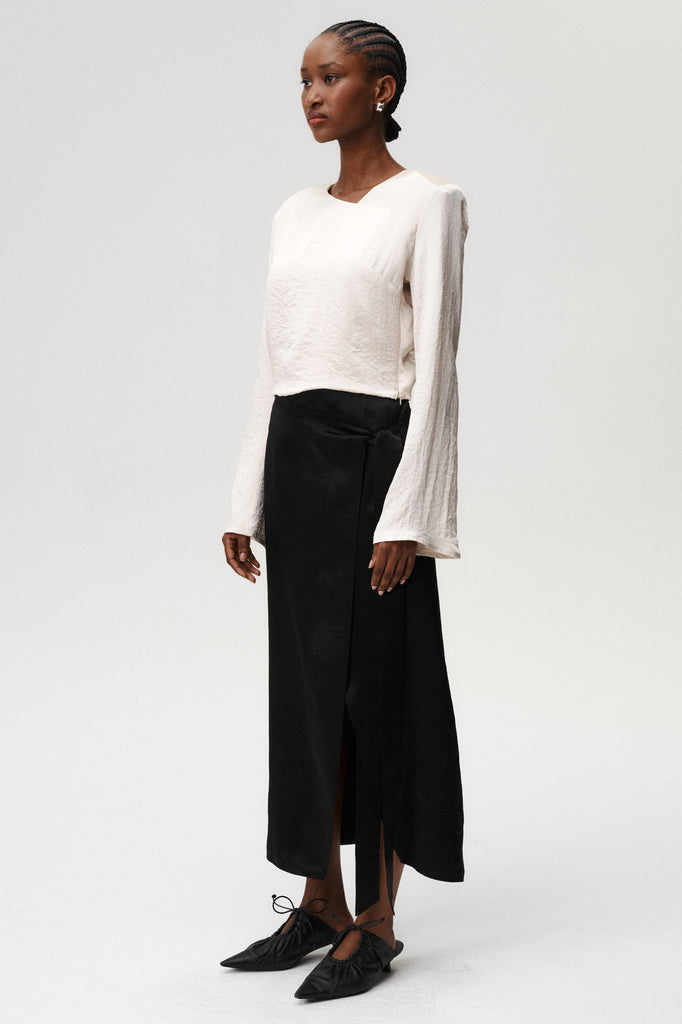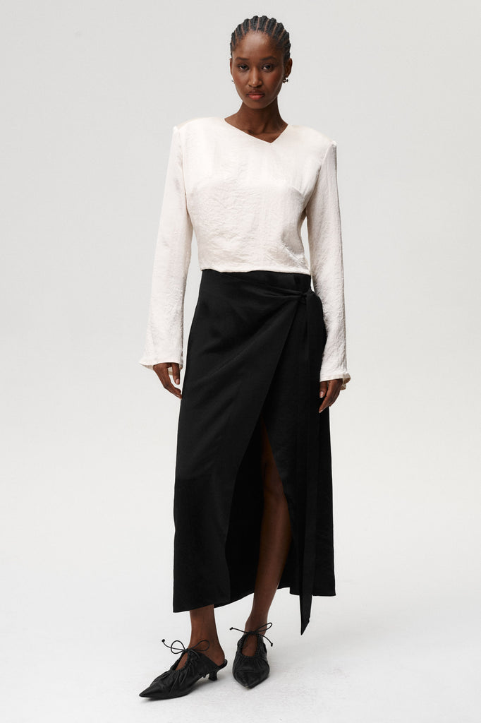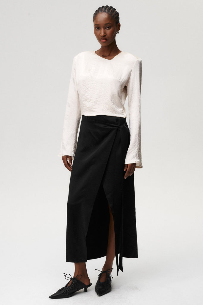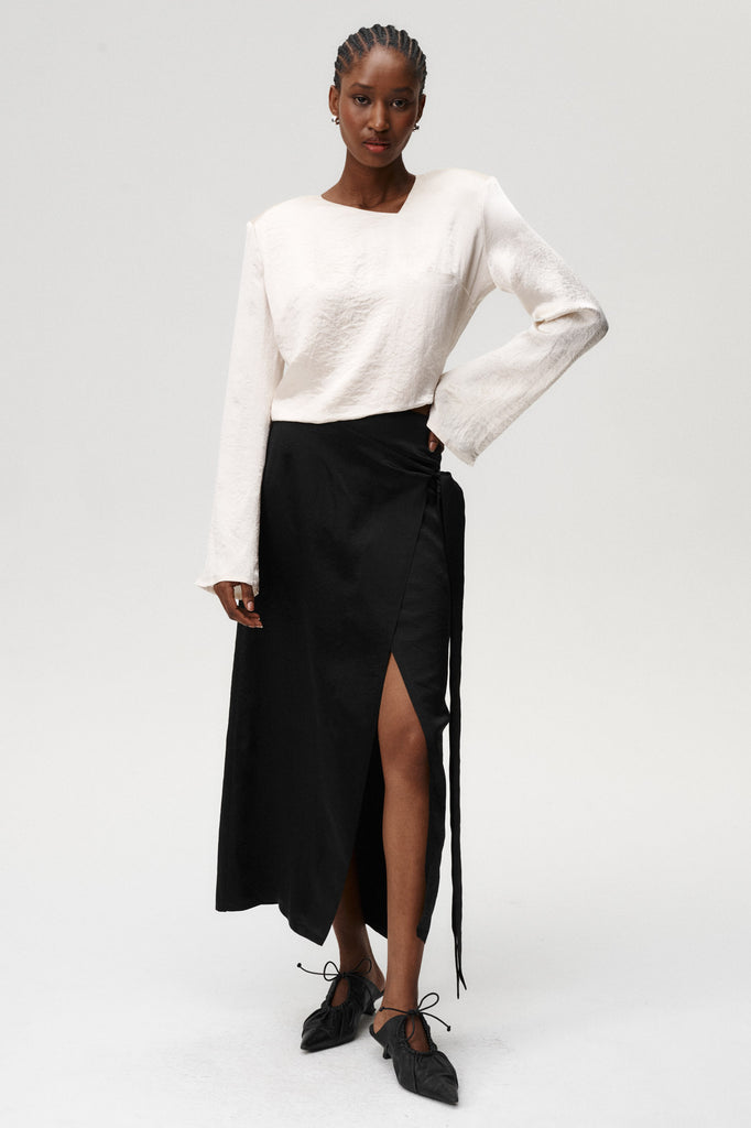 The Lareina Skirt brings a classic wrap silhouette into focus. A decorative front tie and leg-revealing slit make it elegant yet subtly daring. Made from satin acetate with a soft crepe finish. The fabric catches the light beautifully while remaining easy to wear. With the sheen of silk and effortless style, Lareina turns simple moments into statement looks.