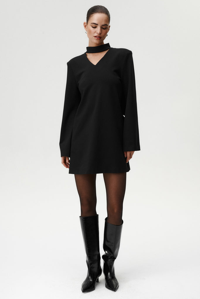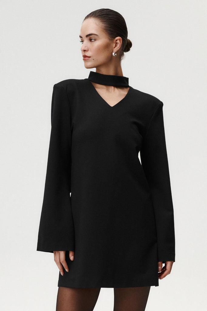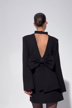 Noel Dress is exploration of structure and modern femininity. This mini captivates with its architectural bow at the back and precise stand collar fastened with discreet snaps. Shoulder pads create a defined, confident line. Also they're detachable - love them or leave them, it's up to you. And the back... triangular open detail and sculpted wide cuffs introduce a sense of effortless allure. This dress is crafted from a thicker, structured fabric and maintains a bold, impeccable form. A statement piece that merges strength with refined elegance.